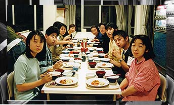 | 多めに人数を頼んでしまっていたので 皆、かなりの量のご飯を食べました。 夜はゲーム大会となりました。途中に歌を挟みながらのゲームで、だいぶ打ち解けてきたころ、グループにわかれてさいころトークが始まりました。 |